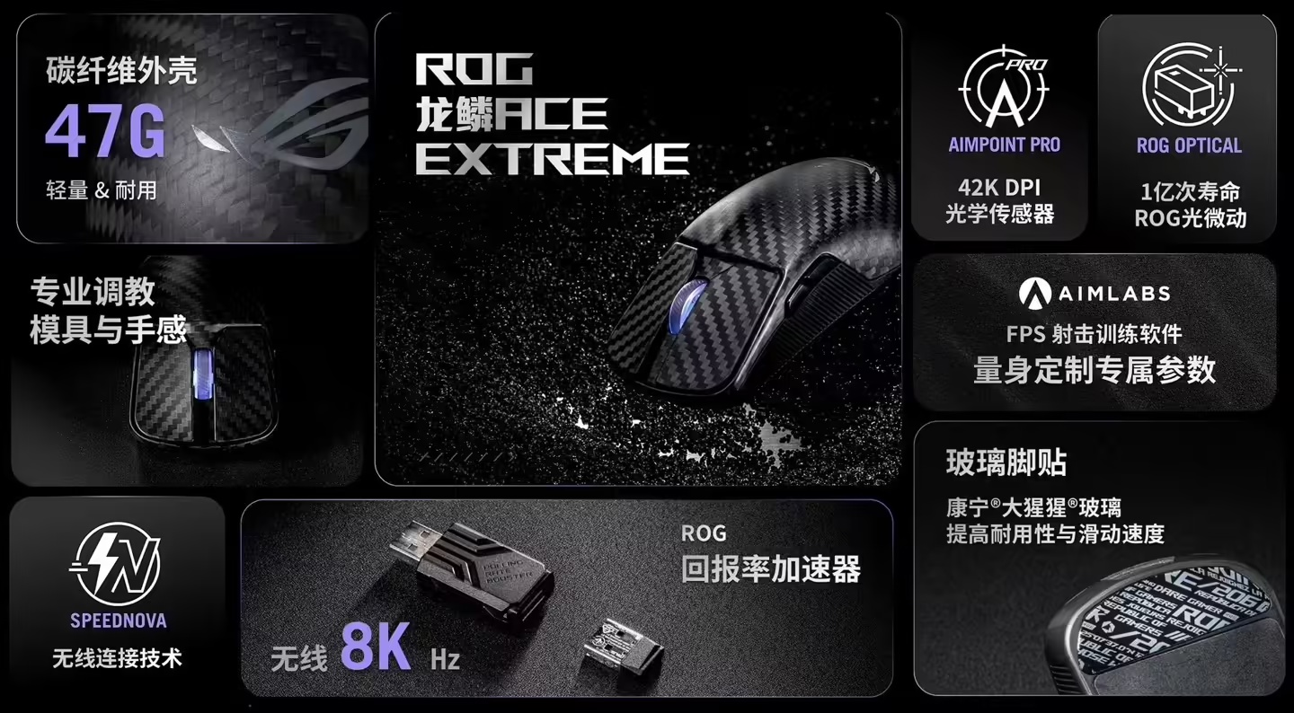 龙鳞 Ace Extreme 鼠标搭载 42K DPI 的 AIMPOINT PRO 光学传感器和一亿次点击寿命的 ROG 光学微动,支持 8000Hz 无线回报率。