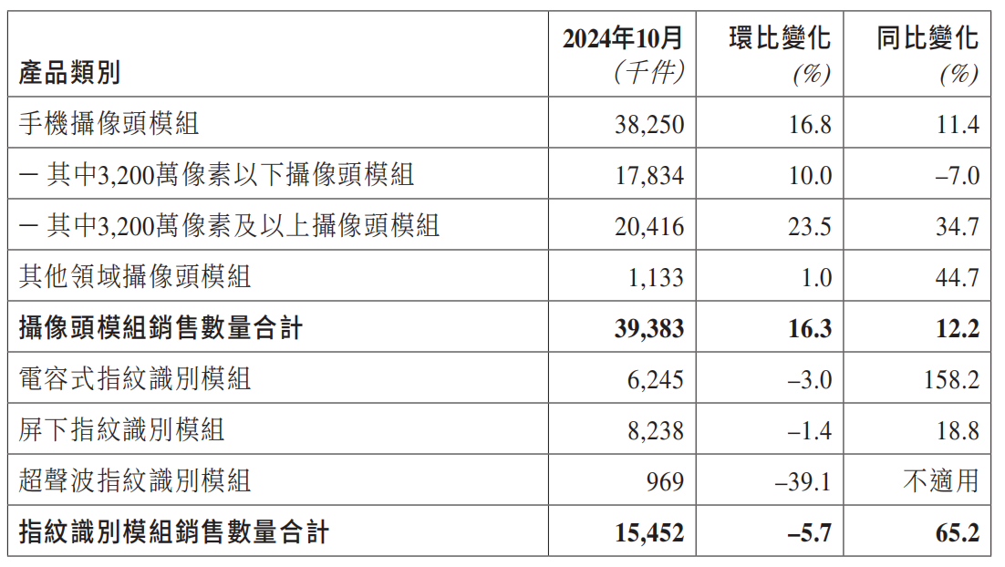 11月11日,丘钛科技发布发布了2024年10月的主营产品销售数据。数据显示,公司在10月份继续保持了稳定的增长势头,手机摄像头模组和指纹识别模组的销量均实现了同比增长。