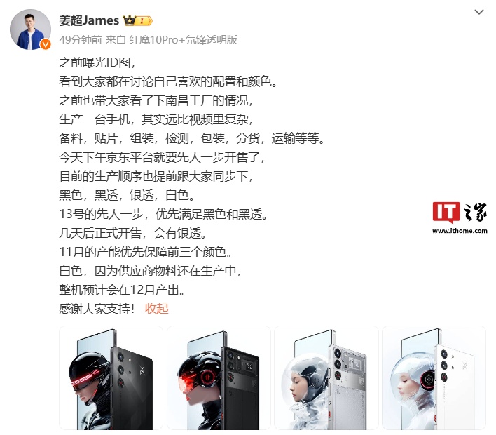 IT之家 11 月 13 日消息,红魔 10 Pro 系列游戏手机将于今日下午 15:00 正式发布,红魔游戏手机产品总经理 @姜超James 今日发文透露了新机销售情况:目前新机的生产顺序是黑色(暗夜骑士)、黑透(氘锋透明暗夜)、银透(氘锋透明银翼)、白色(白昼武士)。