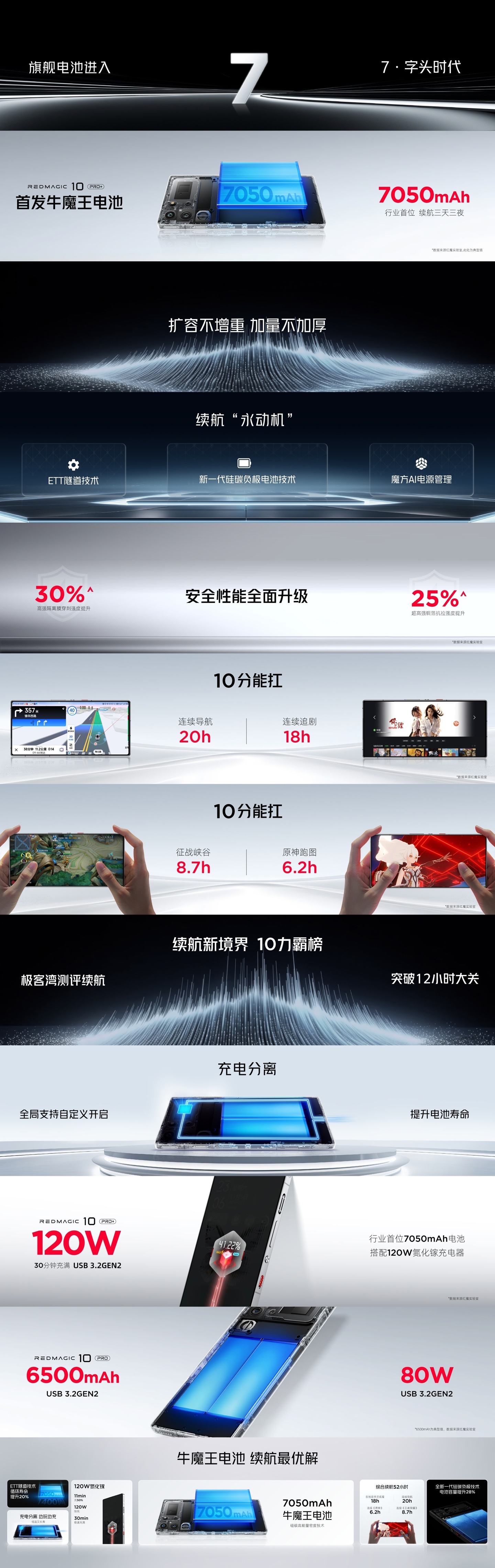红魔 10 Pro 手机将首发 7050mAh 高能量密度“牛魔王电池”,搭载 ETT 隧道技术、新一代硅碳负极电池技术、魔方 AI 电源管理三大技术,支持自定义充电分离 2.0。