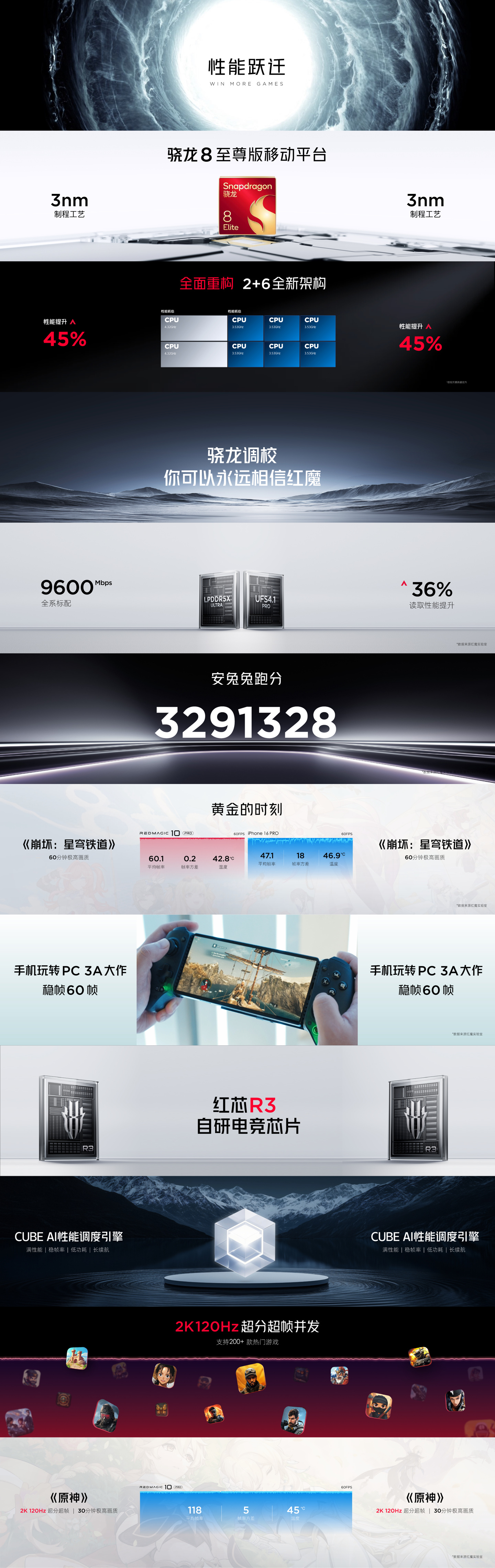 红魔 10 Pro 手机配备红芯 R3 自研电竞芯片,内置自研超竞画质 2.0,支持 2K+120FPS 超分超帧并发,适配超 200 款游戏。官方宣称新机玩《崩坏:星穹铁道》平均帧率 60.1、玩《原神》平均帧率 118。