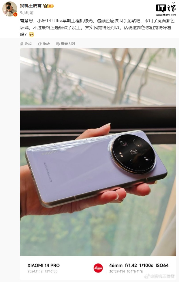 IT之家 11 月 14 日消息,博主 @搞机王腾霄 昨晚分享了一组小米 14 Ultra 早期工程机照片,该机同样采用了圆形镜头模组设计,但是配备了紫色亮面玻璃后壳。