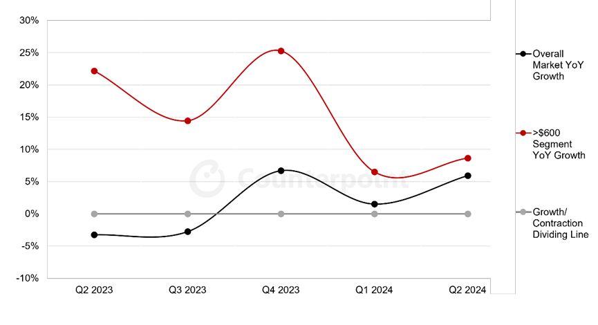 IT之家 11 月 14 日消息,市场调查机构 Counterpoint Research 昨日(11 月 13 日)发布博文,报告称 2024 年上半年中国手机市场加速推进高端化,超过 600 美元(IT之家备注:当前约 4338 元人民币)的细分市场销售同比增长 8%,而整体市场同比增长 4%。