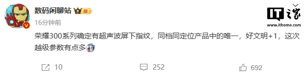 IT之家 11 月 14 日消息,博主 @数码闲聊站 今日爆料称,荣耀 300 系列确定有超声波屏下指纹,同档同定位产品中的唯一。在此之前,该博主已多次爆料荣耀数字系列新机参数,IT之家汇总如下: