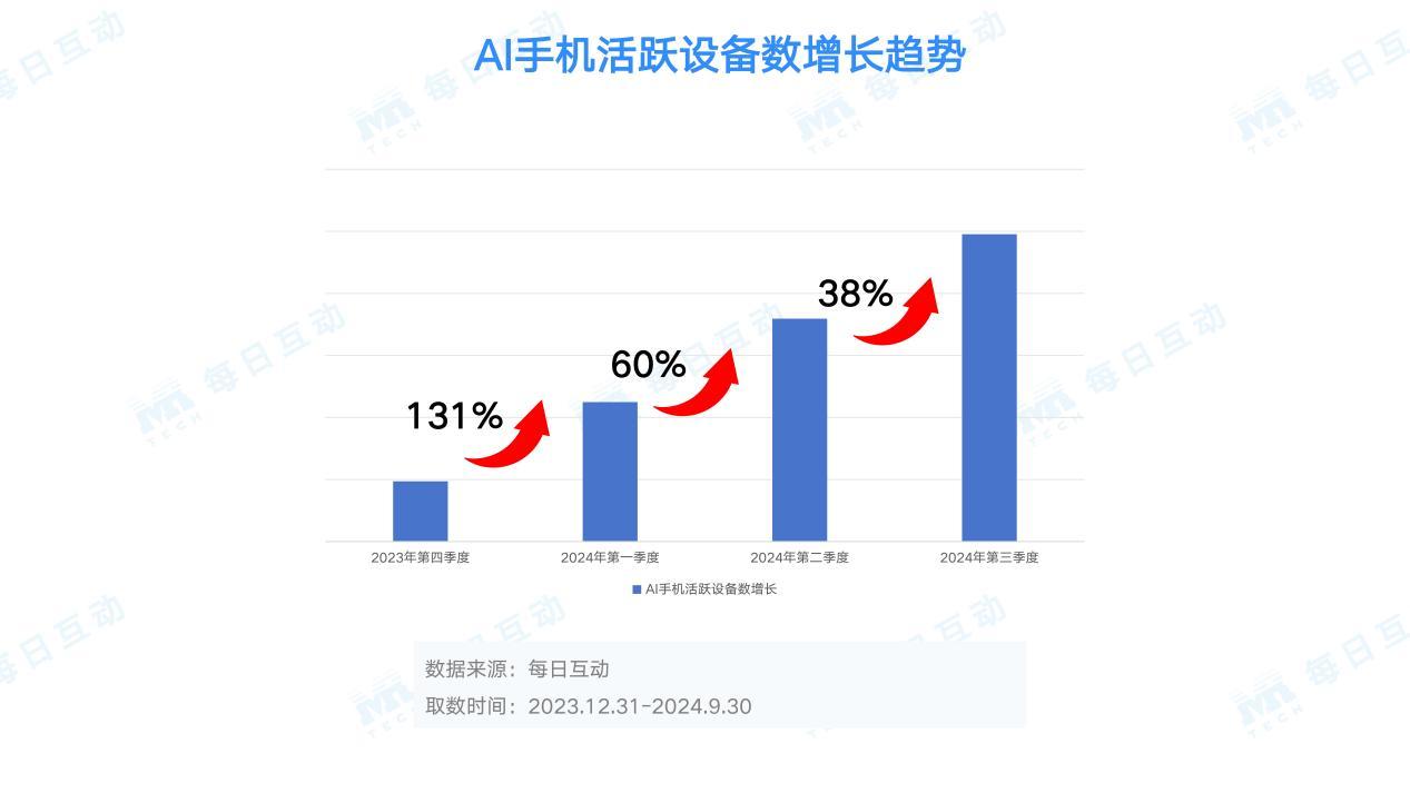 从AI手机活跃设备的增长趋势看,AI手机保持稳健的正比例增长,每季度设备增长量也较为稳定。但从增长比例来看,从2023年底到2024年第一季度迎来一波爆发式增长,涨幅达131%;2024年第二季度环比增速下降为60%,第三季度环比增速下降为38%,增长趋于平缓。