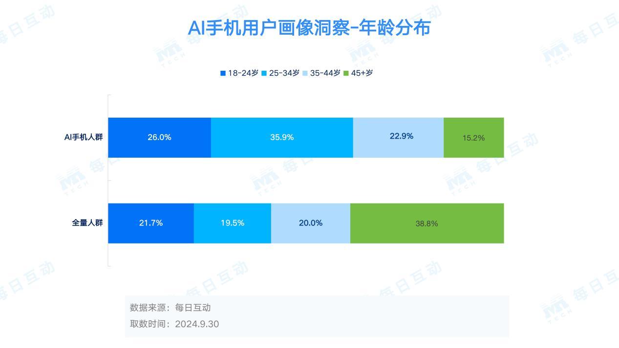 对于AI手机的用户画像。数据显示,AI手机的男性用户占比58.4%,相对于全量人群的TGI为1.13;而女性TGI仅有0.88。进一步洞察发现,尝鲜AI手机的用户,主力是25-34岁九零后乃至零零年群体,达到35.9%。他们相对于更年轻的群体有更强的经济实力,而相对更年长的群体,则更有更浓的技术兴趣和探索欲去购买使用AI手机。