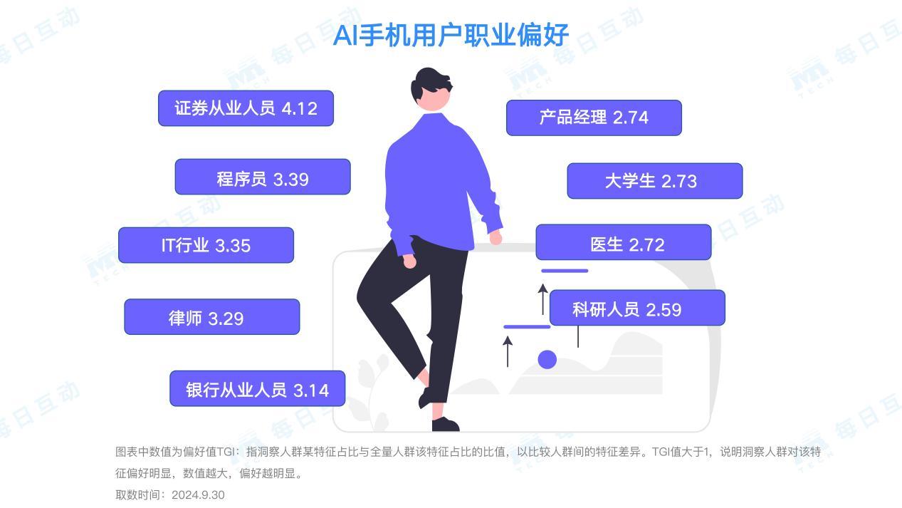 从职业分布来看,证券从业人员使用AI手机的TGI高达4;程序员、IT行业、律师、银行从业人员的TGI也高达3。由此可见,更“费脑”的高薪高知的行业群体更容易被AI手机打动。