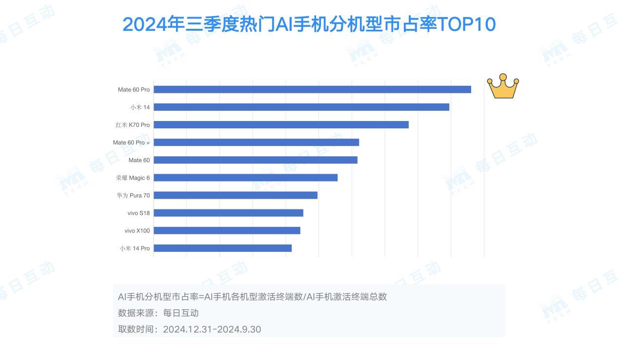 热门AI机型市占率方面,2024年前三季度华为表现强势,Mate 60 Pro、Mate 60 Pro+、Mate 60、Pura 70在热门机型的TOP10榜单中占据四个名额,分走27%市占率。小米不甘示弱,前十占据三个名额,吃下21%市占率。vivo上榜2位,带走9%市占率。前十热门AI机型共占据62%的AI手机市场份额。