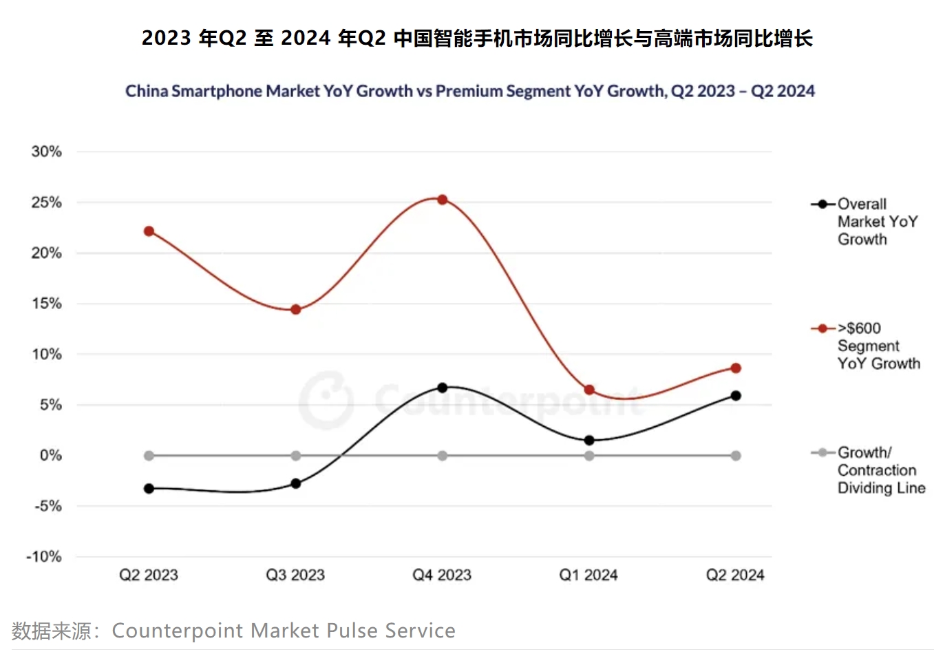 C114讯 11月14日消息(颜翊)Counterpoint发布报告称,2024年上半年,中国高端市场的增长速度已超过整体智能手机市场。售价超过600美元的高端手机市场销售同比增长了8%,而整体市场的增长率为4%。在2023年,高端市场同比增长16%,整体市场同比下降1%。