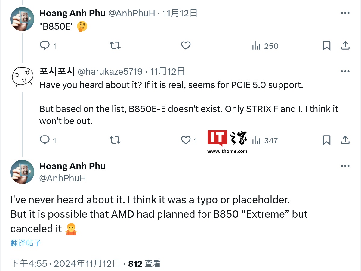 此外,X 平台消息人士 Hoang Anh Phu (@AnhPhuH) 也表示其并未听说过 AMD“B850E”。