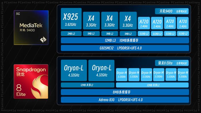 天玑9400采用了台积电3nm制程工艺,在多任务处理和高性能场景中,天玑9400表现出色,尤其在多核性能上表现强劲,在游戏和日常使用中的体验有着显著提升。骁龙8至尊版引入了高通自研的Oryon CPU架构,同样采用了台积电3nm制程工艺,功耗控制极其出色,性能对比前代上升一个档次。