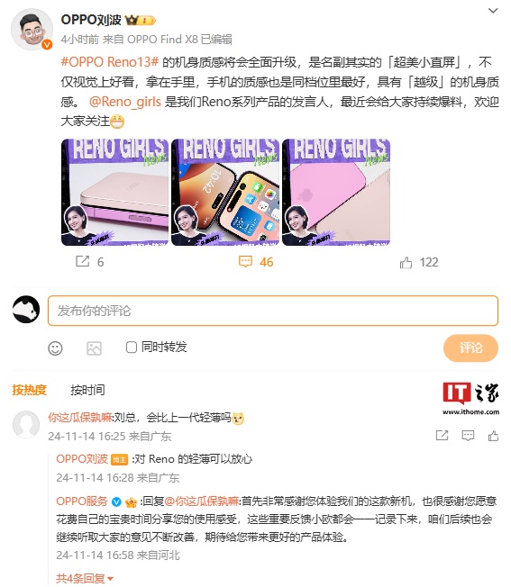 IT之家 11 月 14 日消息,OPPO Reno 系列产品发言人账号 @Reno_girls 今日发布视频,透露了新机 Reno 13 部分信息。