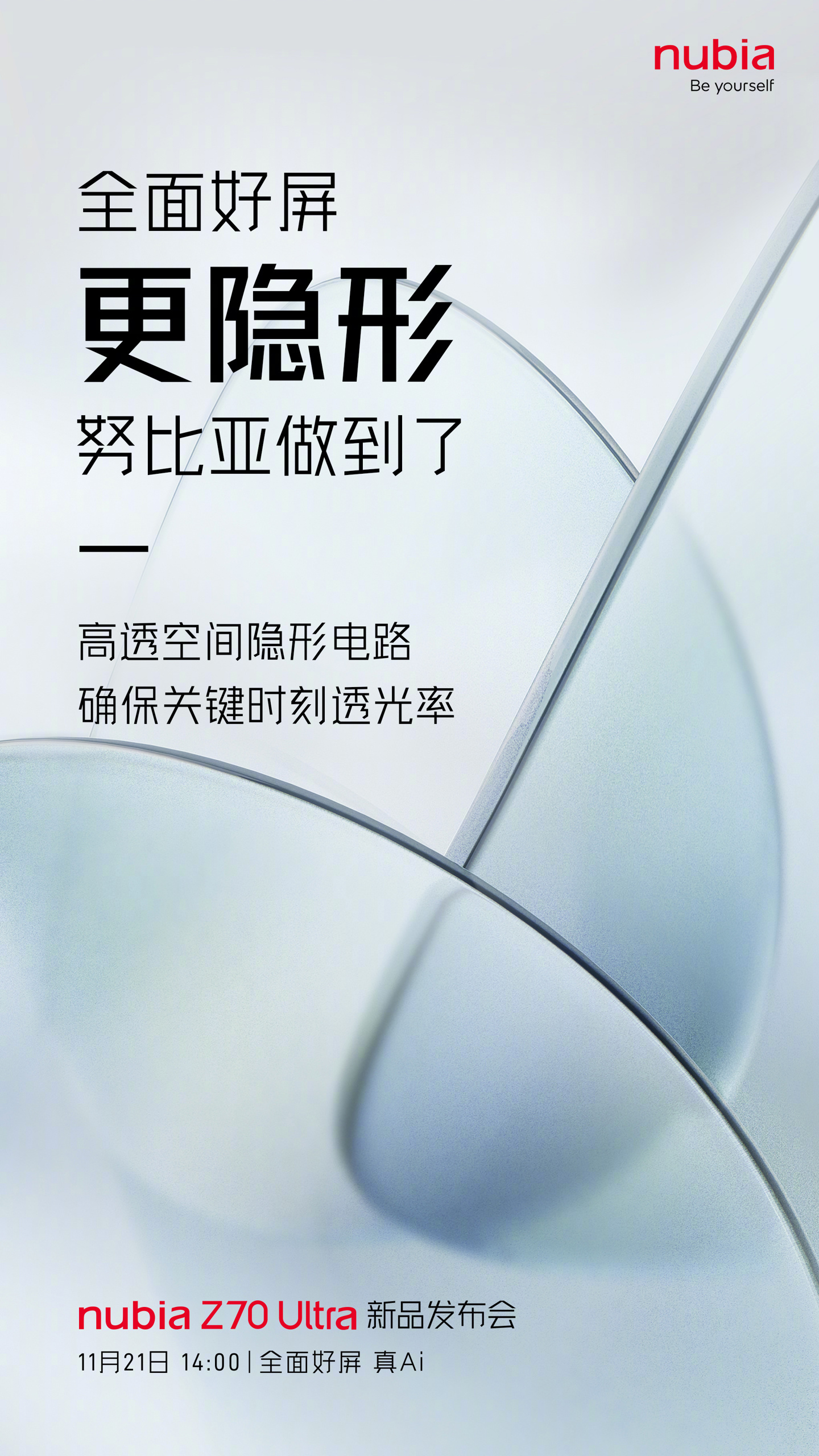 IT之家 11 月 14 日消息,努比亚 Z70 Ultra 手机今日官宣将于 11 月 21 日发布,新机将配备 6.85 英寸、95.3% 屏占比 1.5K 真全面无孔屏。