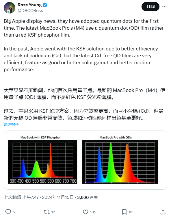 IT之家 11 月 15 日消息,Ross Young 发现,苹果新推出的 2024 款 MacBook Pro 采用量子点显示技术。
