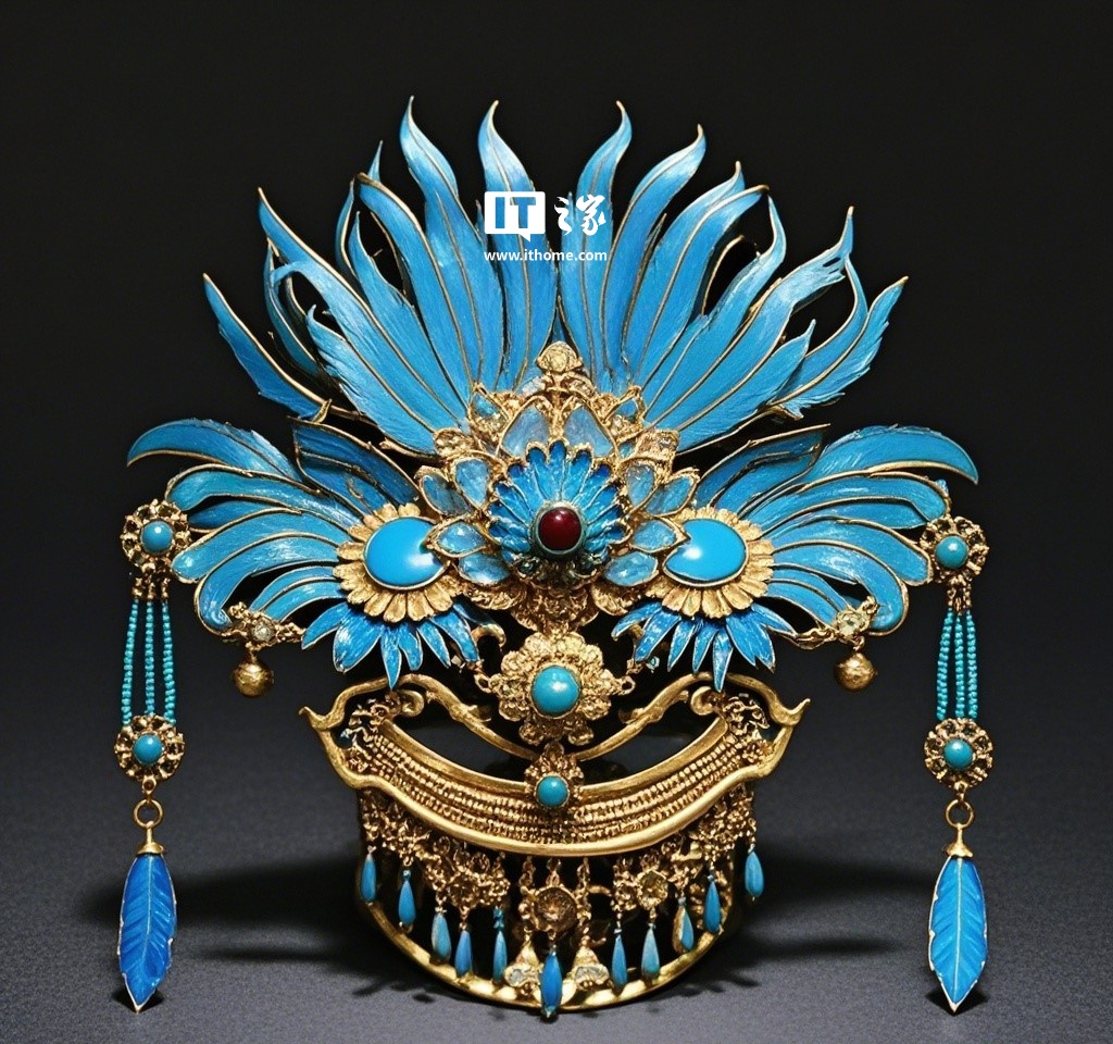 IT之家注:采用“点翠”制作的首饰结合了金银底座和亮蓝色的翠鸟尾羽,拥有独特美感。