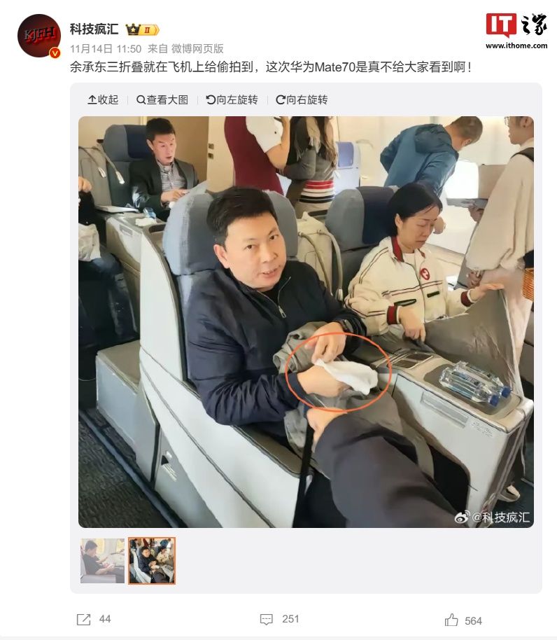 直播主持人提到,前两天刷到一张余承东在飞机上坐着,好像捂着口袋的照片。余承东表示,Mate70 确实在口袋里没拿出来,“我担心被别人偷拍。”