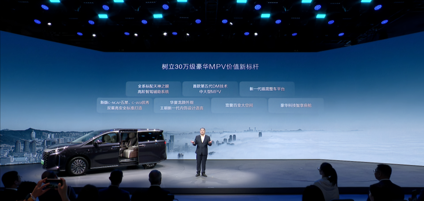 内饰方面,这款车型采用了 15.6 英寸悬浮式中控屏、12.3 英寸副驾娱乐屏、15.6 英寸中央吸顶屏组合,配备手机无线充电、双杯槽以及岛台下方的置物槽,后排还支持连接游戏手柄、AR 眼镜等。