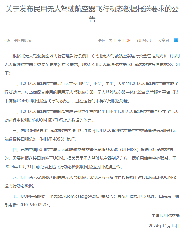 四、已向中国民用航空局无人驾驶航空器空管信息服务系统(UTMISS)报送飞行动态数据的,需要将报送接口切换至 UOM。相关民用无人驾驶航空器制造方应与民航局信息中心联系,于 2024 年 12 月 31 日前完成上述飞行动态数据联网报送接口切换工作。