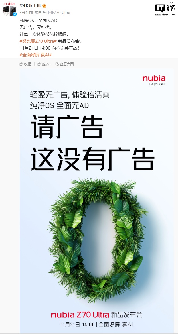 IT之家 11 月 15 日消息,努比亚今日宣布,Z70 Ultra 手机搭载纯净 OS,“无广告,零打扰”。这款新机将于 11 月 21 日 14:00 发布。