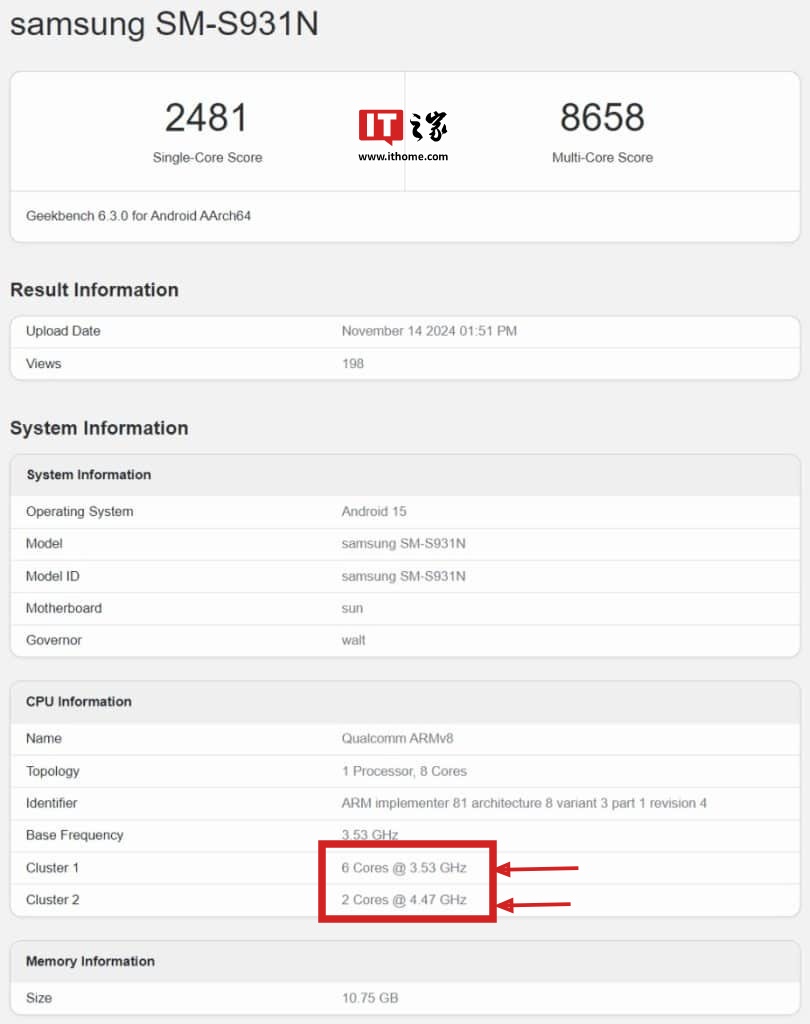 根据跑分库页面信息,该机型号为 SM-S931N,在 GeekBench 6.3.0 版本中单核成绩为 2481 分,多核成绩为 8658 分。