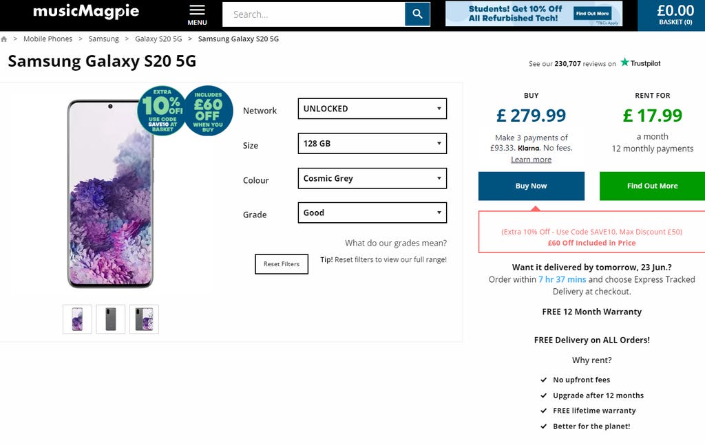 MusicMagpie的产品页面让你很容易看到你要购买的手机的确切状况。MusicMagpie/Andrew Lanxon的截图/CNET