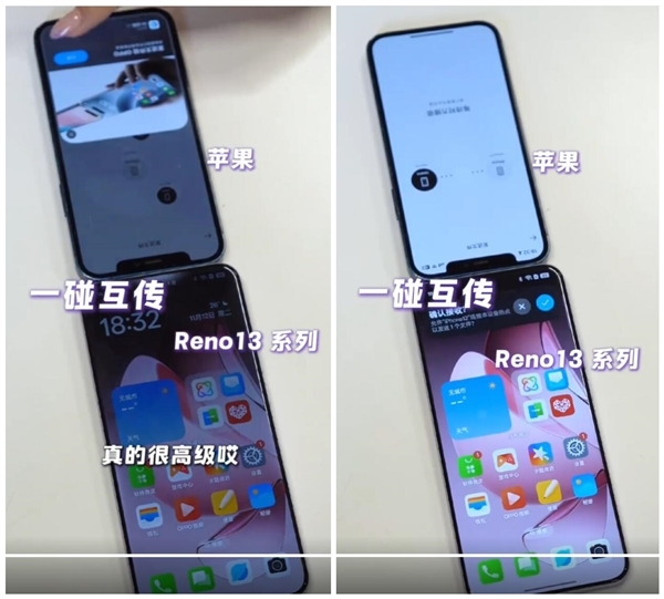 另外,OPPO Reno产品经理还演示了Reno13系列的一碰互传功能,只需将Reno13和iPhone碰一碰,iPhone上的LIVE图就能无缝传给OPPO Reno13,利好苹果用户换OPPO手机。