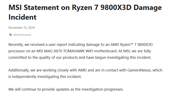 今天,微星发布了一则简短的官方声明,表示正在与AMD密切合作,并联系相关用户、媒体,对此次意外进行调查,会随时通报调查进展。