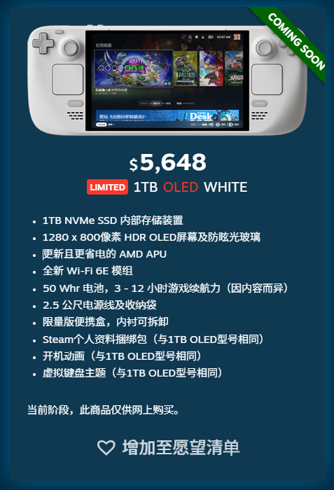 为了防止黄牛党,V 社限制每个账户只能订购一台白色 Steam Deck,且使用的 Steam 账户必须在 2024 年 11 月之前至少有一次购买记录。