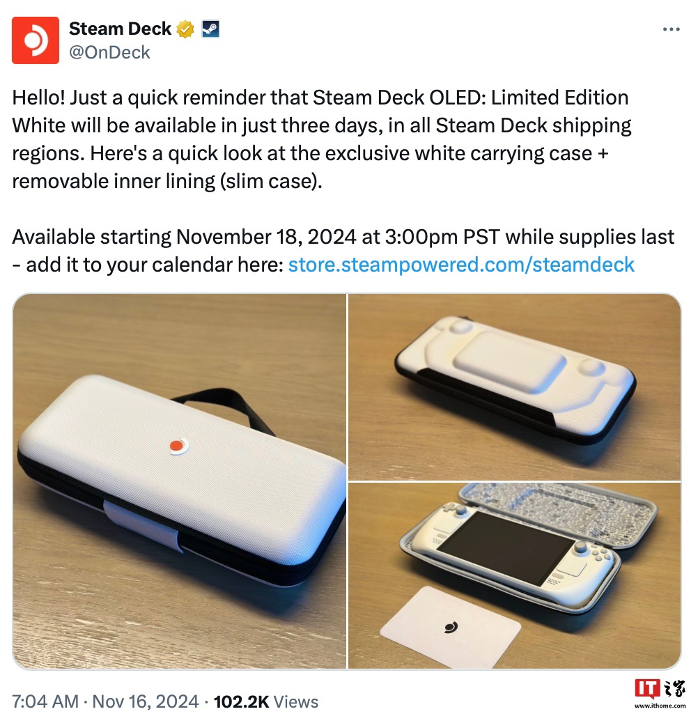 IT之家 11 月 16 日消息,Steam Deck 的 X 平台官方账号今天展示了 V 社即将在北京时间 11 月 19 日限量发售的白色版 Steam Deck OLED 游戏机,该机除了外观外,其他方面均与 1TB 型号标准款相同,定价为 679 美元(IT之家备注:当前约 4884 元人民币),比标准版贵了 30 美元(当前约 217 元人民币)。