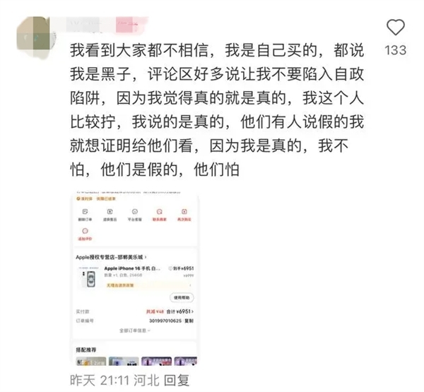面对网友质疑,该女生晒图证实自己在苹果直营店下的iPhone 16订单,这名女生已将情况反馈给苹果客服,正在等待苹果的答复。