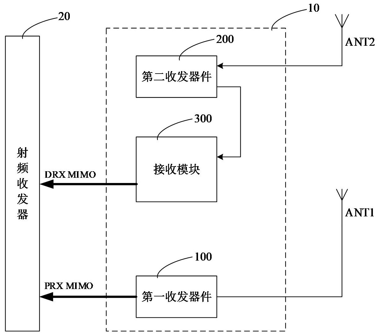 本申请实施例涉及一种射频前端模组和通信设备,射频前端模组包括接收模块、第一收发器件和第二收发器件;第一收发器件用于支持对来自第一天线ANT1的射频信号中的第一频段信号的主集接收处理,并支持对来自第一天线ANT1的射频信号中的第二频段信号的主集接收处理,还用于将处理后的信号传输至射频收发器的第一主集接口;第二收发器件与接收模块连接,用于支持对来自第二天线ANT2的射频信号中的第一频段信号的接收处理,并将来自第二天线ANT2的射频信号中的第二频段信号传输至接收模块;接收模块用于支持对来自第二收发器件的第二频段信号的接收处理。