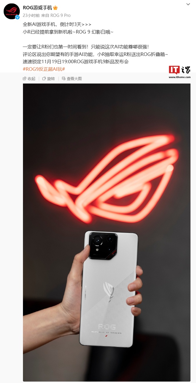 IT之家 11 月 17 日消息,华硕官方昨日放出 ROG 游戏手机 9 幻影白配色实拍图,该配色采用纯白后盖设计,摄像头做纯黑处理,同时后置个性化点阵 LED。