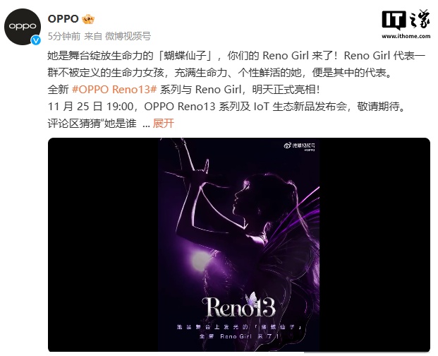 IT之家 11 月 17 日消息,OPPO 今日官宣,OPPO Reno13 系列及 IoT 生态新品发布会定档 11 月 25 日 19:00,全新 OPPO Reno13 系列与 Reno Girl 明天正式亮相。