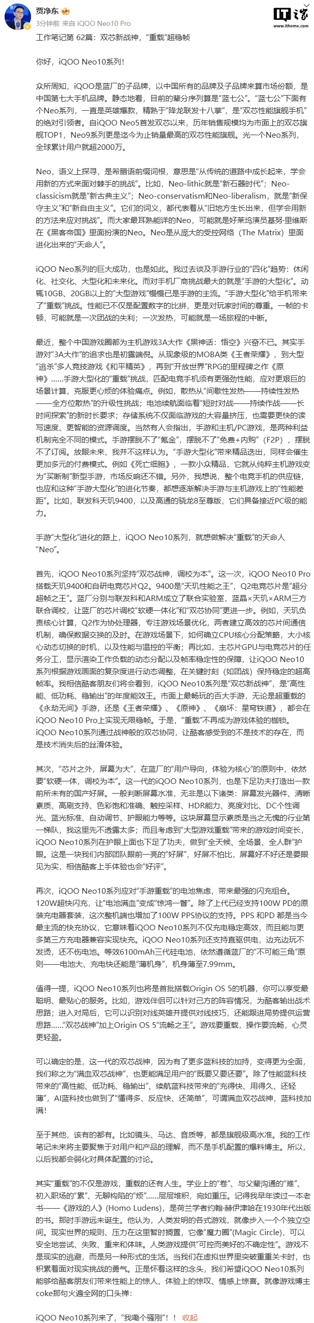 贾净东透露,市面上最畅玩的百大手游,无论是超重载的《永劫无间》手游,还是《王者荣耀》、《原神》、《崩坏:星穹铁道》,都会在 iQOO Neo10 Pro 上实现无限稳帧。此外,该机的屏幕显示素质是当之无愧的行业第一梯队。
