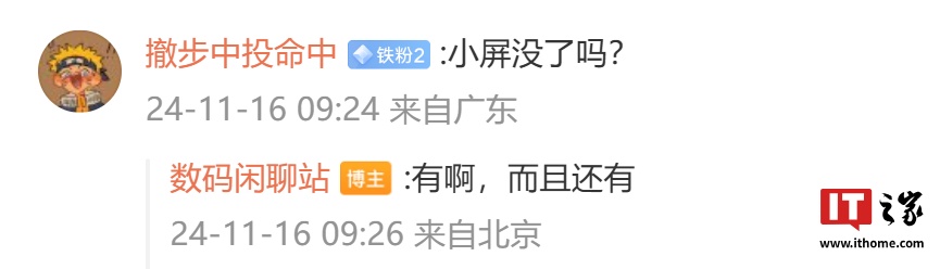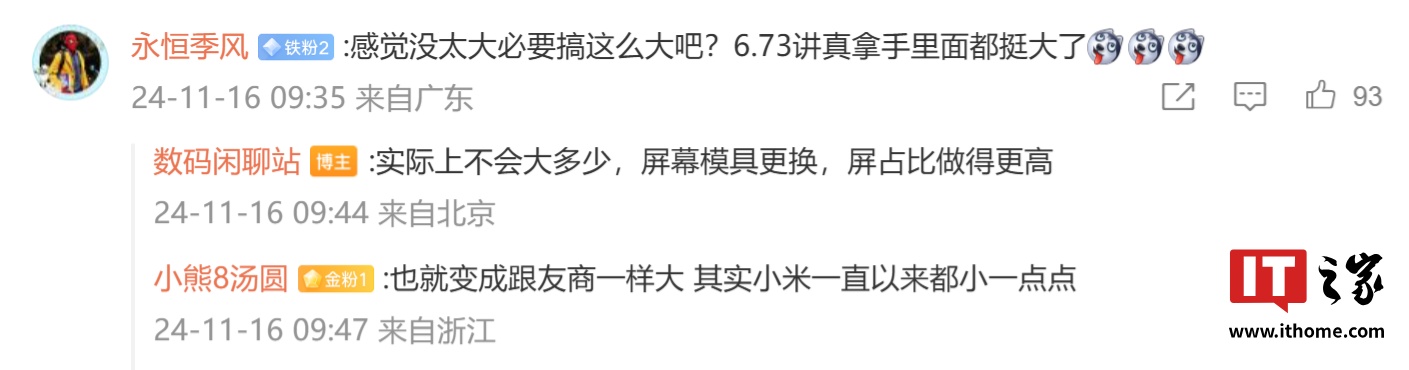 博主在评论区称,目前已备案待发的 2K 屏机子,屏幕尺寸没什么变化;且由于屏幕模具更换,屏占比做得更高,(相比 6.73 英寸)实际上不会大多少;此外小屏机器仍然存在。