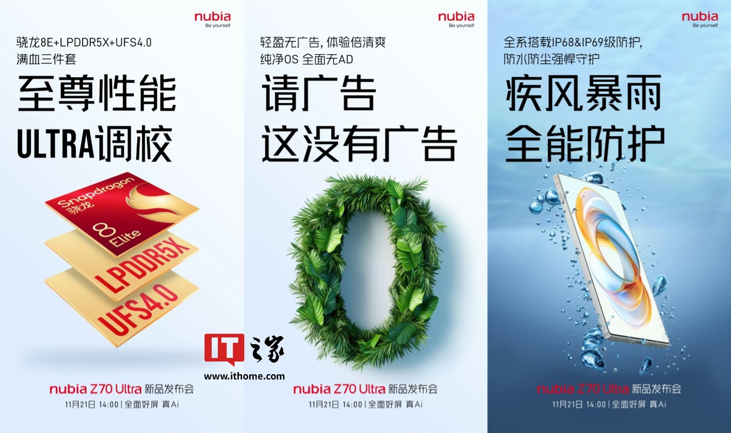 据此前报道,努比亚 Z70 Ultra 手机已官配备载骁龙 8 至尊版 + LPDDR5X + UFS4.0 满血三件套、全系搭载“IP68、IP69 满级防护”,同时新机预装纯净 OS,号称“无广告,零打扰”。