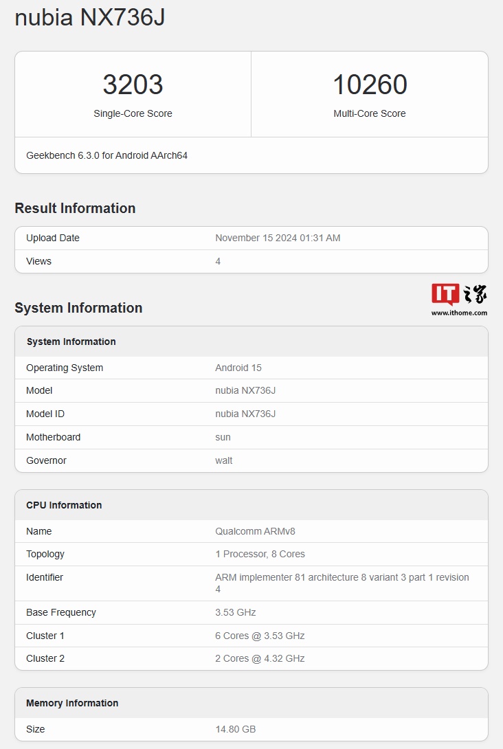 GeekBench 数据库显示这款新机拥有 16GB 内存,预装安卓 15 系统,其 CPU 部分信息也与骁龙 8 至尊版一致:6 Cores @ 3.53 GHz+2 Cores @ 4.32 GHz。