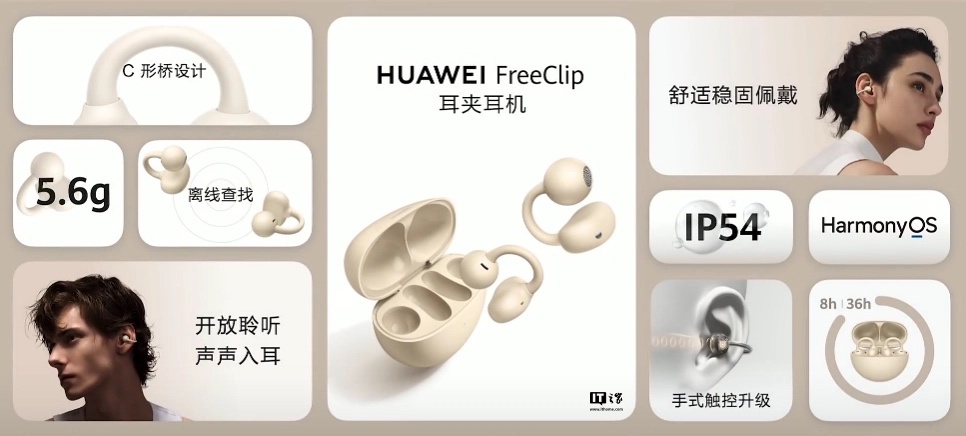 华为于 2023 年 12 月发布了 FreeClip 耳夹耳机,现售价为 1199 元,号称是业界首款左右耳自动识别的开放式耳机,采用“C 形桥”设计,应用镍钛记忆合金,佩戴稳固舒适,单耳仅重 5.6g;C 桥部分则配备自适应传感器,可调节卡扣的夹力,其薄悬臂梁中含有 9 根核心线。