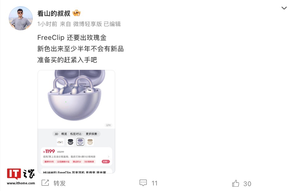 IT之家 11 月 17 日消息,博主 @看山的叔叔 发文称华为将为旗下 FreeClip 耳夹耳机推出“玫瑰金”配色,而在“新色出来后,至少半年不会有新品”。