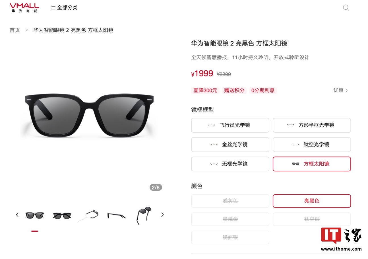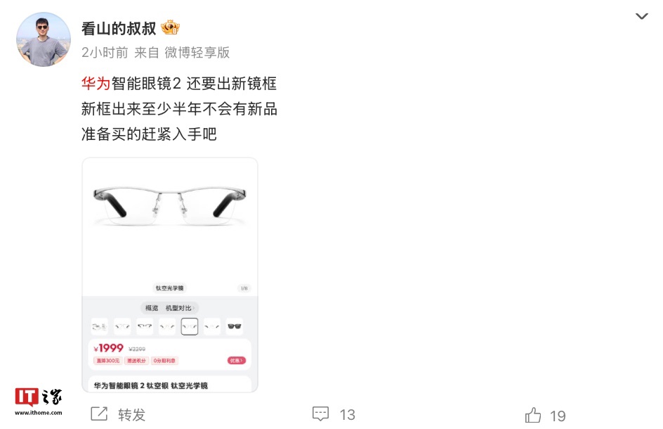 IT之家 11 月 17 日消息,博主 @看山的叔叔 在微博发文,称华为智能眼镜 2 将推出新镜框,目前这款眼镜可选“飞行员光学镜”、“方形半框光学镜”、“金丝光学镜”、“钛空光学镜”、“无框光学镜”、“方框太阳镜”共计六种镜框,定价从 1399-1999 元不等。