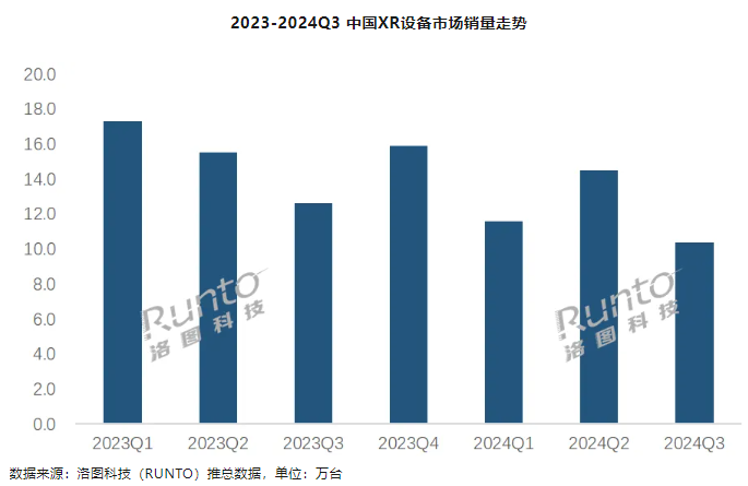 IT之家 11 月 18 日消息,根据洛图科技最新发布的《中国 XR 设备零售市场月度追踪报告》显示,2024 年第三季度,中国消费级 XR 设备(包括 AR 和 VR)的全渠道零售销量为 10.3 万台,同比下降 17.9%;销售额为 3.5 亿元,同比下降 9.2%。