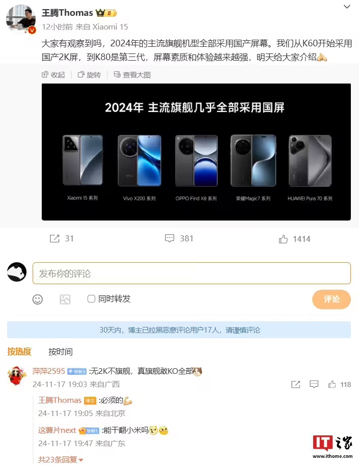 小米中国区市场部副总经理、Redmi 品牌总经理王腾昨日发文称,Redmi 从 K60 开始采用国产 2K 屏,到 K80 是第三代。