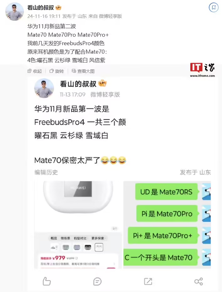 博主 @看山的叔叔 上周六发文透露了华为 Mate70 系列新机研发代号: