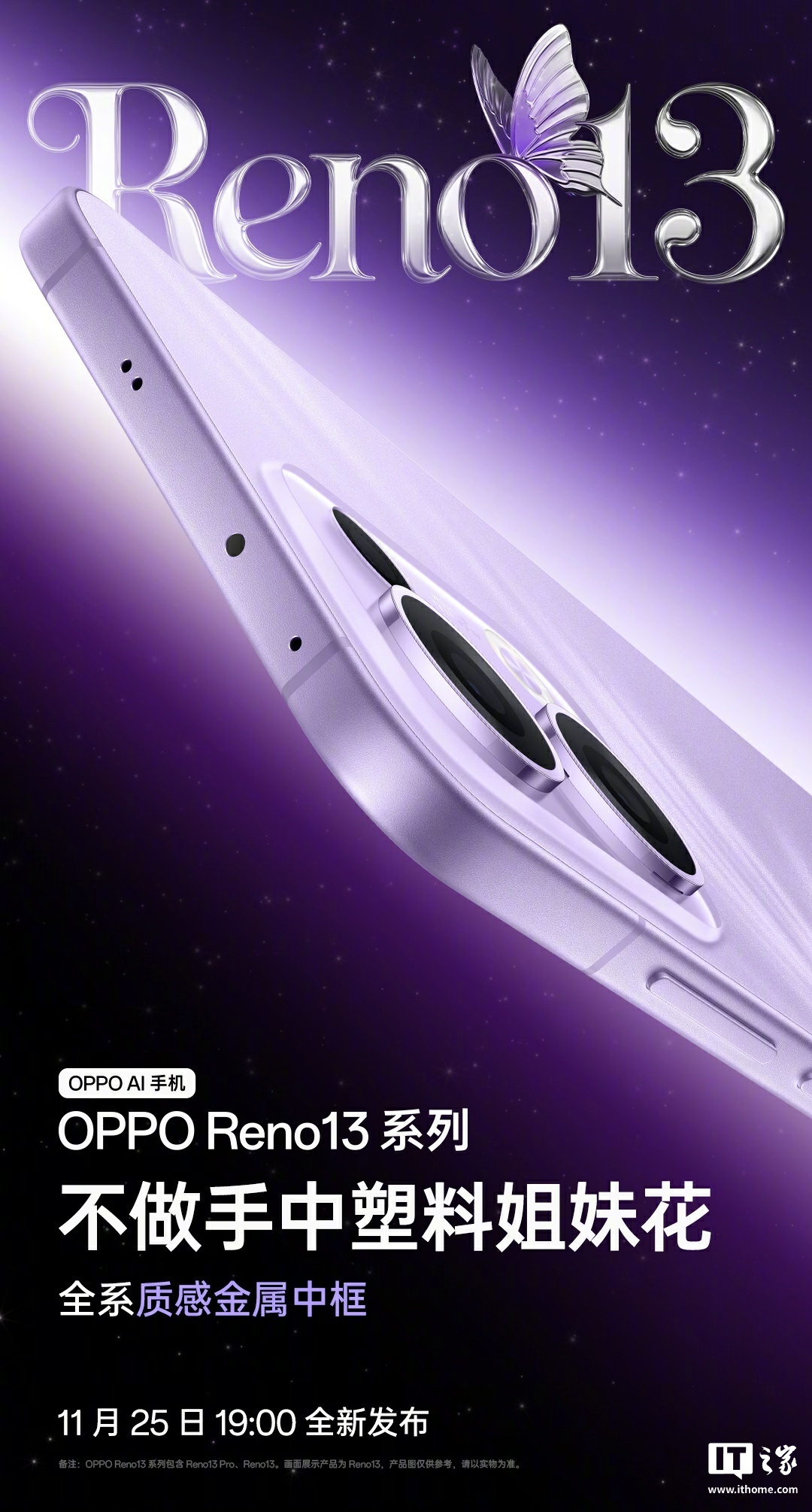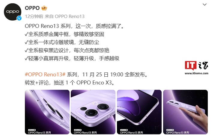OPPO 官方今日发文称 Reno13 系列手机“质感拉满了”:系列新机全系采用质感金属中框 + 一体式冷雕玻璃工艺;同时 Reno 13 全系采用极窄黑边设计,号称“轻薄小直屏再升级”。