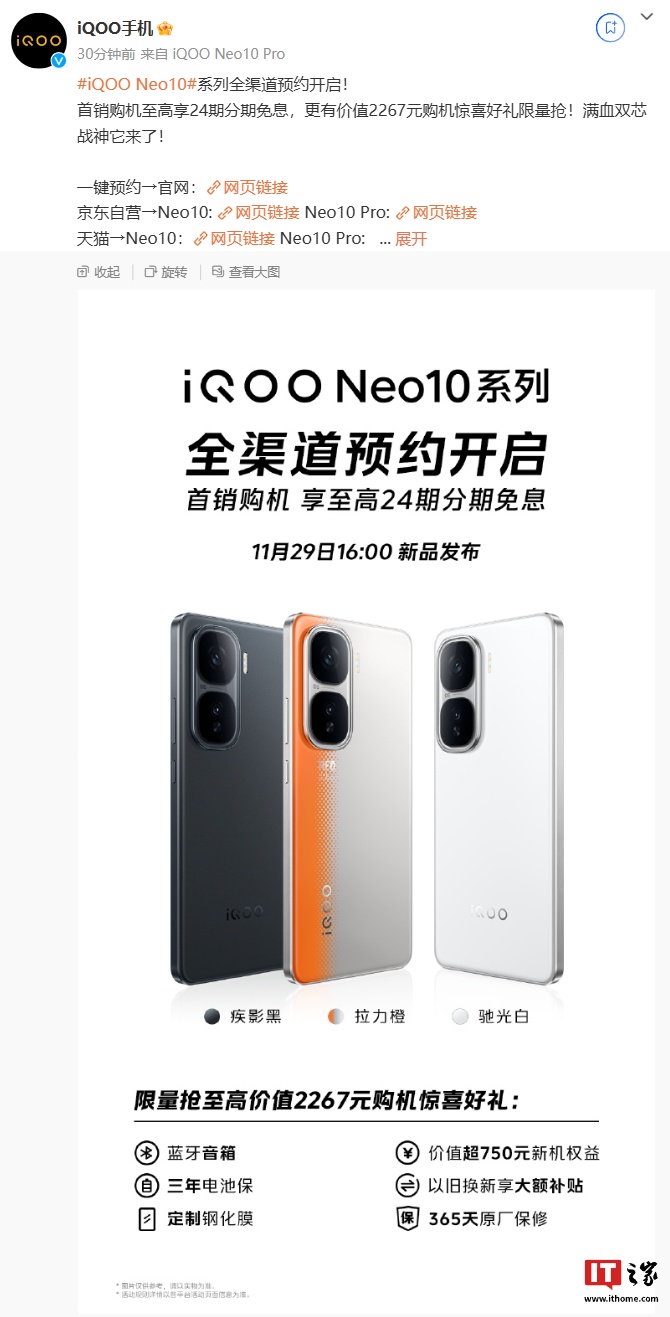 IT之家 11 月 18 日消息,iQOO Neo10 系列手机今日定档 11 月 29 日 16:00 发布,号称“双芯战神”。目前系列新机开启全渠道预约,三种配色外观均已公布,分别是:极影黑、拉力橙、驰光白。