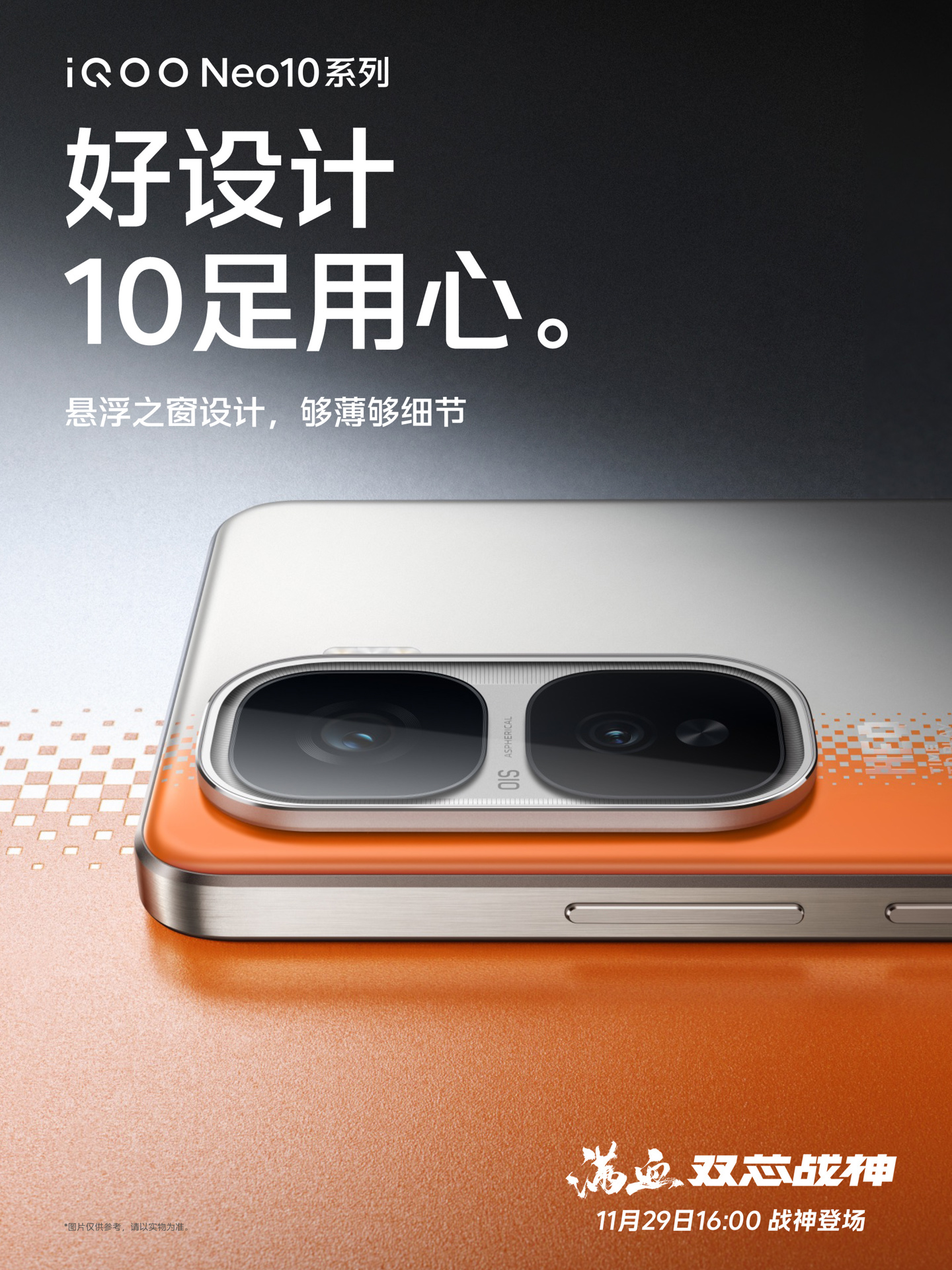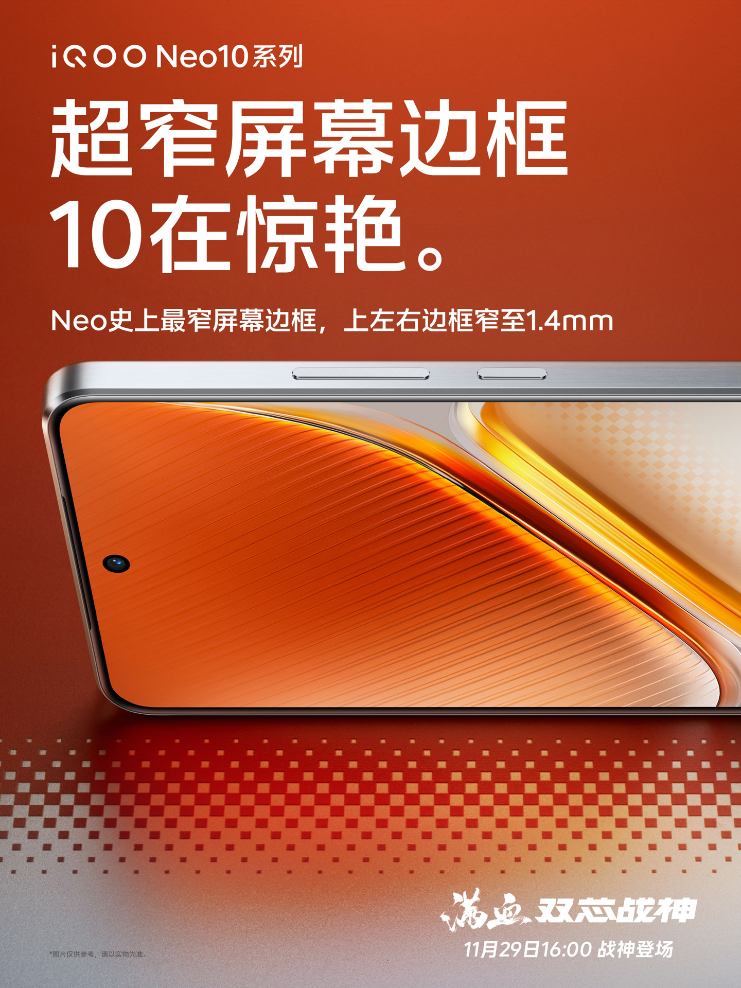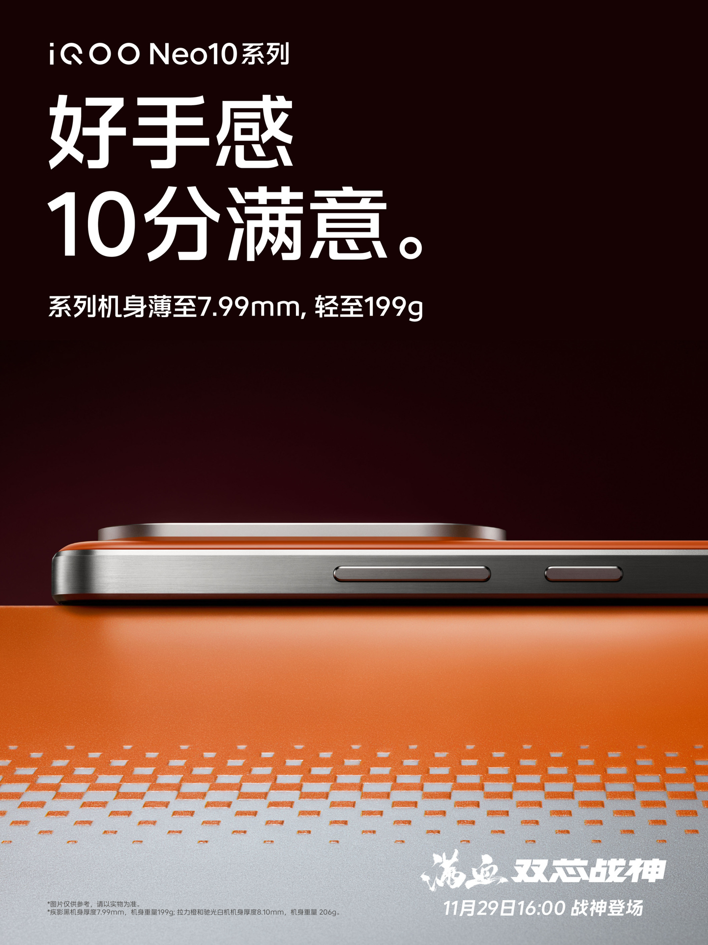 根据 iQOO 官方最新预热,Neo10 系列新机的机身厚度 7.99mm 起、重量 199g 起,镜头部分采用“悬浮之窗”设计,屏幕上左右边框约 1.4mm,号称“Neo 史上最窄屏幕边框”。