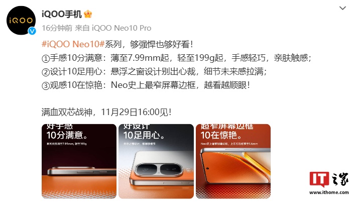 IT之家 11 月 18 日消息,iQOO Neo10 系列手机今日定档 11 月 29 日 16:00 发布。目前系列新机已开启全渠道预约,三种配色外观均已公布,分别是:极影黑、拉力橙、驰光白。