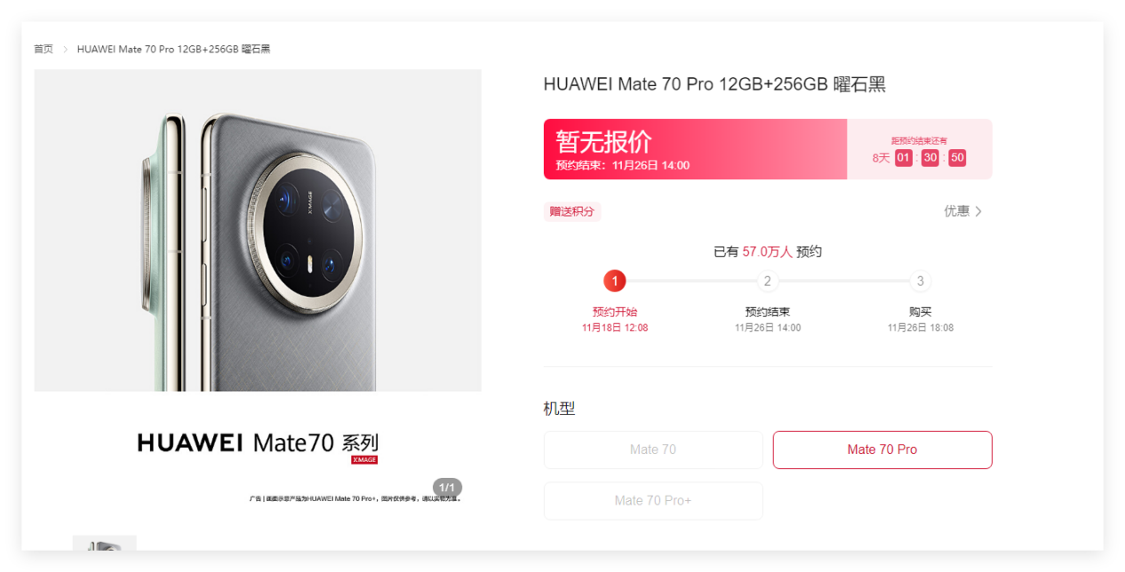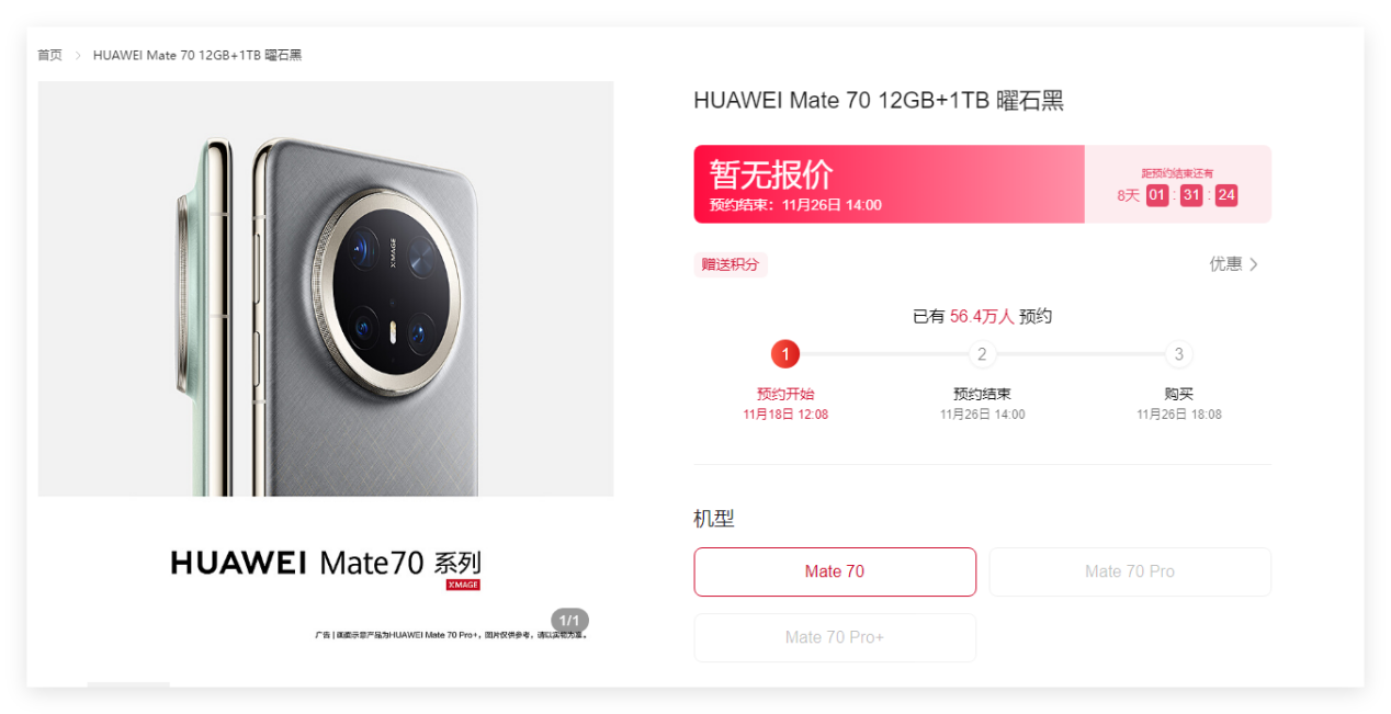 目前开启预约的共有Mate 70、Mate 70 Pro和Mate 70 Pro+三款机型,预约无需支付订金,为免费预约。