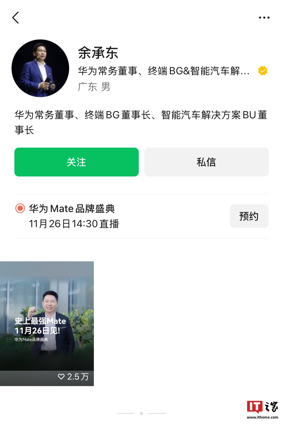 IT之家 11 月 18 日消息,华为余承东现已入驻微信视频号,认证为“华为常务董事、终端 BG 董事长、智能汽车解决方案 BU 董事长”。