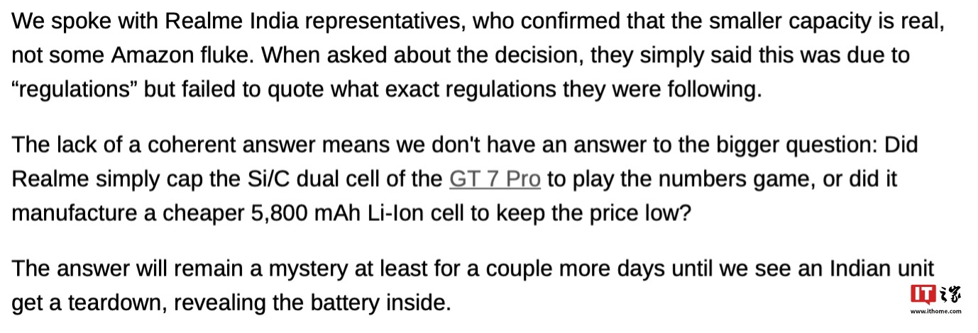 外媒联系 realme 印度代表获悉,海外(印度)版本 realme GT7 Pro 手机电池容量设为 5800 毫安时的原因主要是因为“法规”,但其并未透露更多消息。